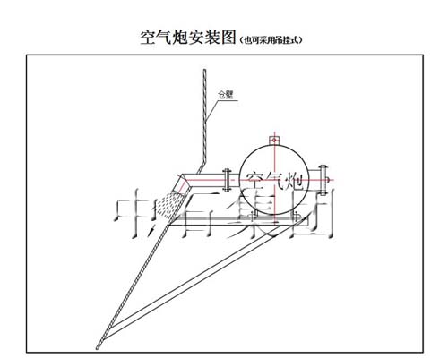 因空氣炮用到鋼結構倉上,炮體小、重量輕,可采用吊掛式,與炮口形成三點定面的穩固結構??諝馀趥}內的噴嘴也是安裝注意的要點,掌握不好,達不到應有的效果。安裝時,應讓噴嘴下唇近貼內倉壁,使噴出的氣流順藏椎體內壁噴發,破處物料支點。